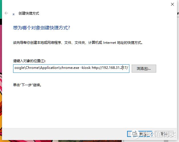 - 找到浏览器根目录下的浏览器主程序(扩展名.EXE),在地址后面加上 -kiosk http://XX.XX.XX.XX(横杠之前有个空格,地址改成自己的iP,怎么查IP,上面有介绍,往上翻)