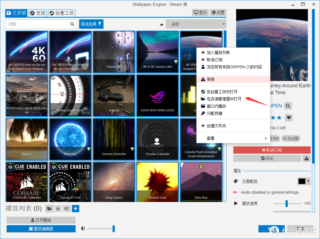 前面提到的制作动态背景图需要用到的视频文件也可以通过这个软件下载。在创意工坊下载喜欢的背景,然后右键选择在资源管理器中打开,就能看到MP4文件了。