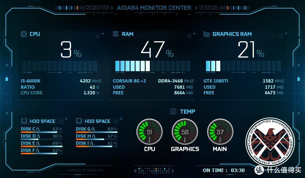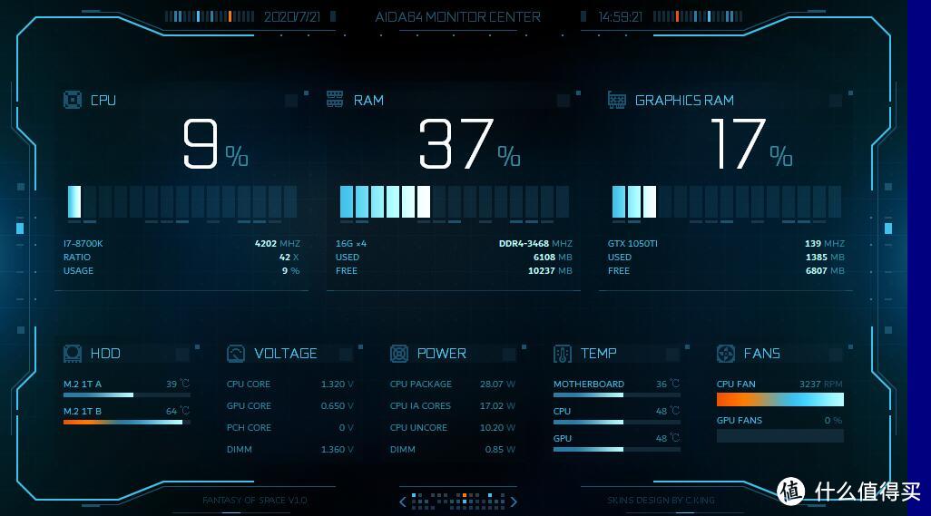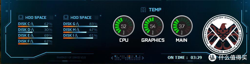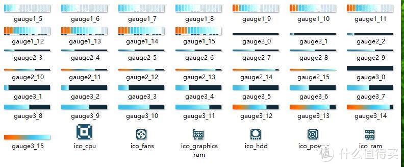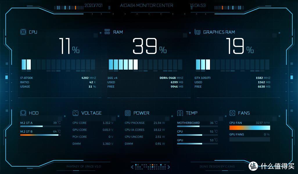 最上面一排:cpu、内存和显卡使用率只需要调整位置,下面那些信息电压、风扇和电源没用去掉,扩充一下硬盘占用信息,添加开机运行时间。