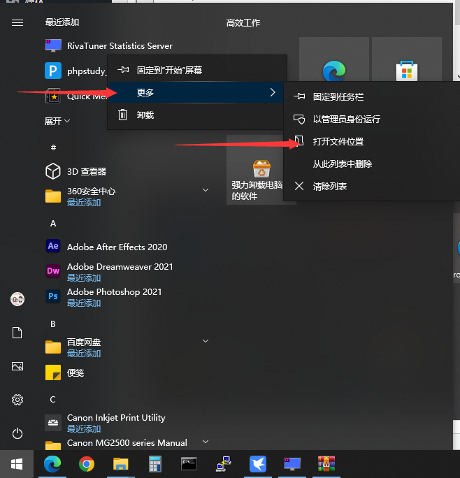 7、Win7桌面会有图标,Win10没有桌面图标,如果都没有桌面图标都是统一的找图标的方法,电脑左下角的开始菜单点一下,找到我们刚才安装的RivaTuner Statistics Server,左键更多,再左键打开文件位置,复制到桌面即可。