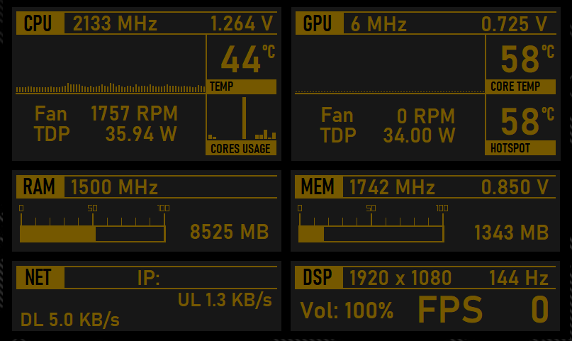 Aida64铜色的SensorPanel模板,LCD项目也支持,字体需要自行下载安装,不会的看教程。 声明:本站所有文章,如无特殊说明或标注,均为本站原创发布。任何个人或组织,在未征得本站同意时,禁止复制、盗用、采集、发布本站内容到任何网站、书籍等各类媒体平台。如若本站内容侵犯了原著者的合法权益,可联系我们进行处理。